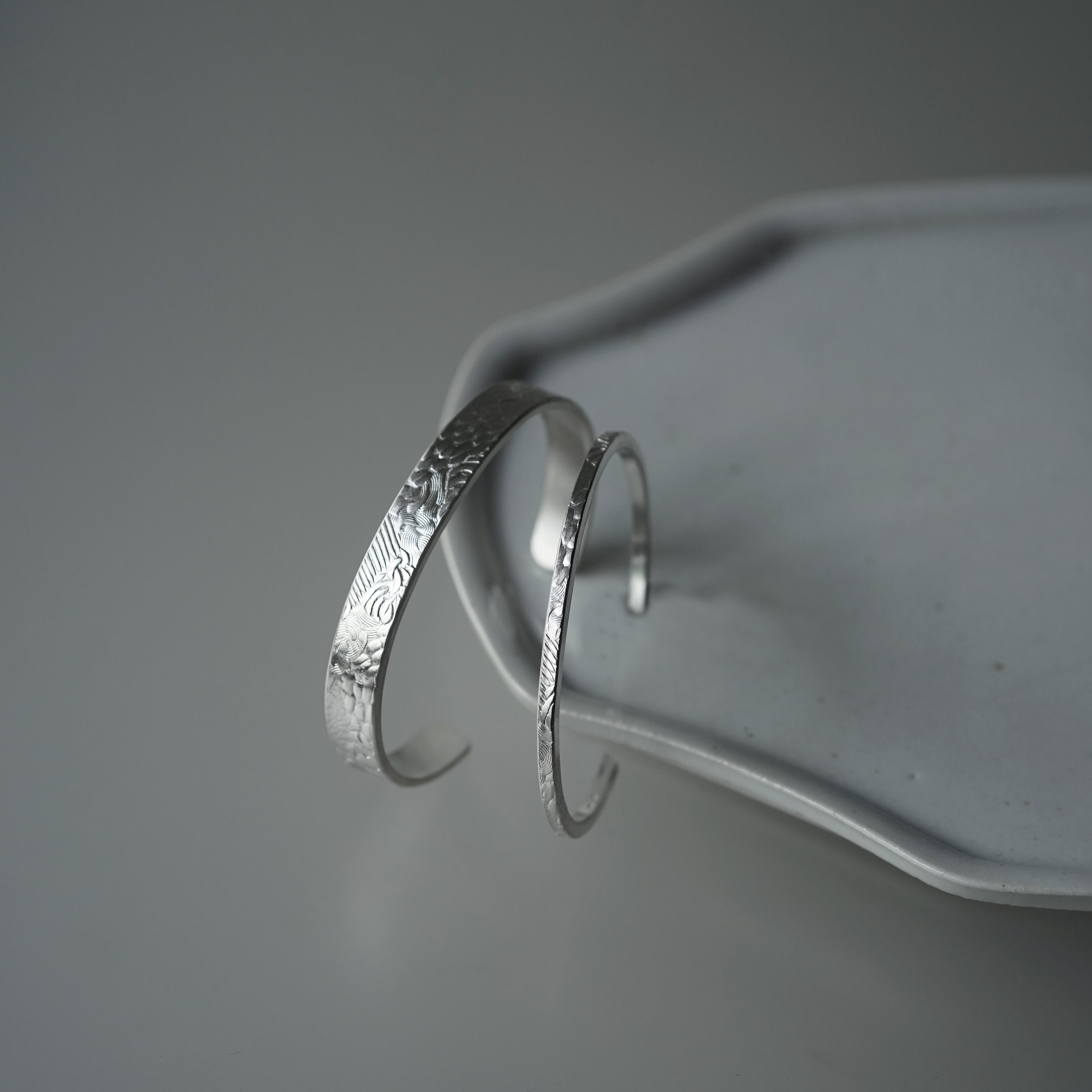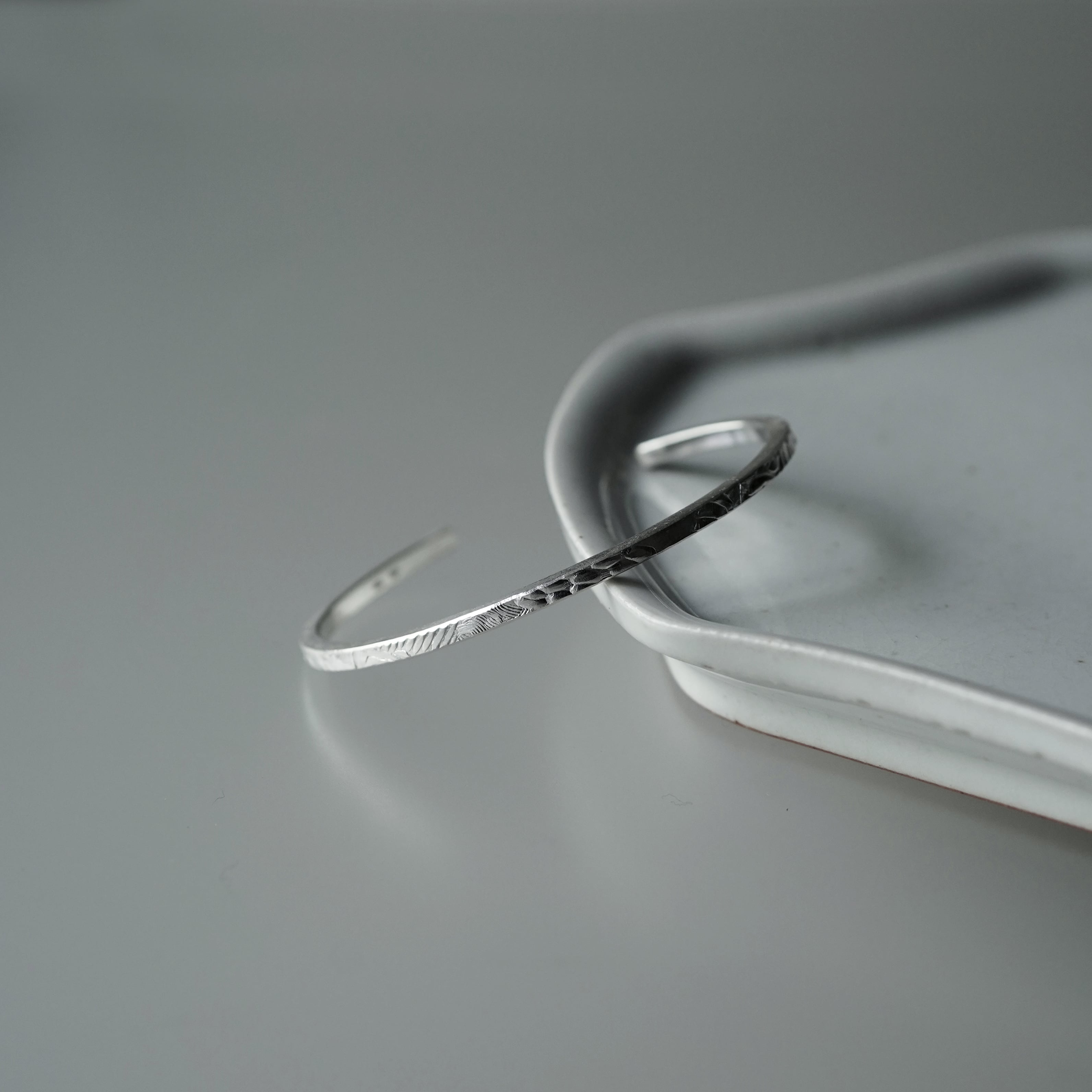 さりげなく裂取りの文様を主張できるシンプルなバングルです。
